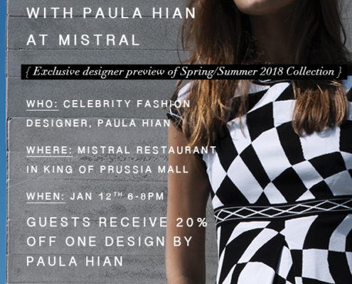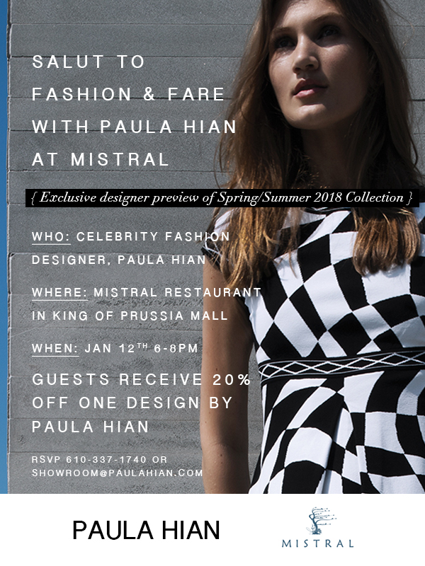 Meet and Mingle with Paula Hian at Mistral KOP. Friday January 12th, 2018 6-8pm
