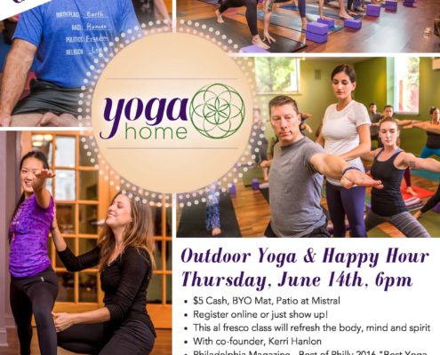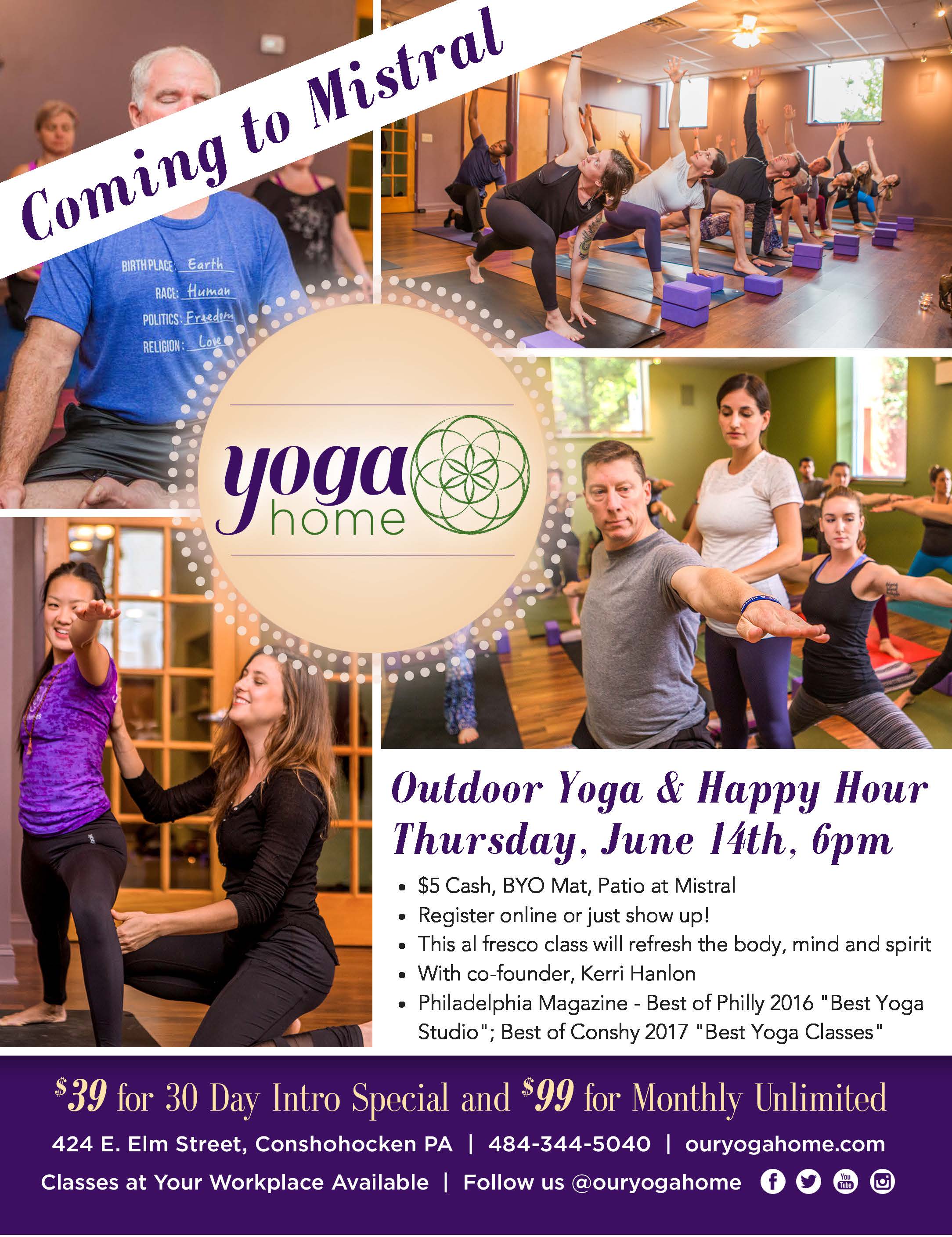 Join Yoga Home Co-Founder Kerri Hanlon for an all levels yoga class followed by Happy Hour at Mistral. The perfect cap to your day, this al fresco class will refresh the body, mind and spirit. Bring a friend or come solo and get an early jump on the weekend. $5 cash only yoga class. Please bring your own yoga mat.